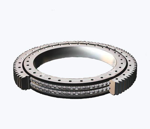 双排球式回转支承具有三个座圈,钢 球和隔离块可直接排入上下滚道,根据受力状况,安排了上下两排直径不同的钢球。这种开式装配非常方便,上下圆弧滚道的承载角都为90°,能承受很大的轴向 力和倾翻力矩。当径向力大于0.1倍的轴向力时滚道须特殊设计。双排球式回转支承的轴向、径向尺寸都比较大,结构紧固。特别适用于要求中等以上直径的塔式 起重机,汽车起重机等装卸机械上。